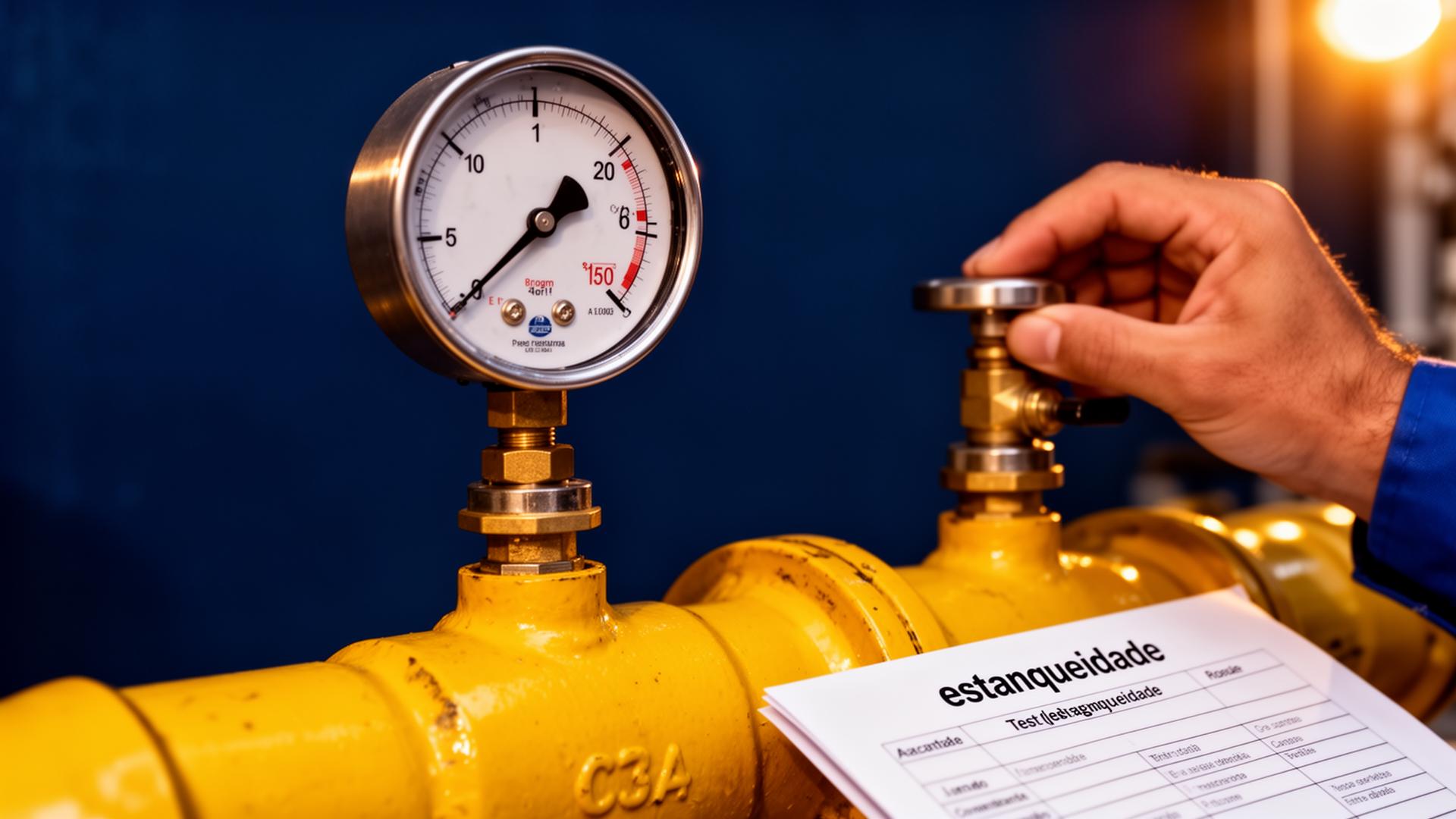 O teste verifica se a rede de gás mantém a pressão durante um intervalo controlado, indicando a integridade do sistema. É um procedimento técnico, com instrumentos calibrados e metodologia definida.